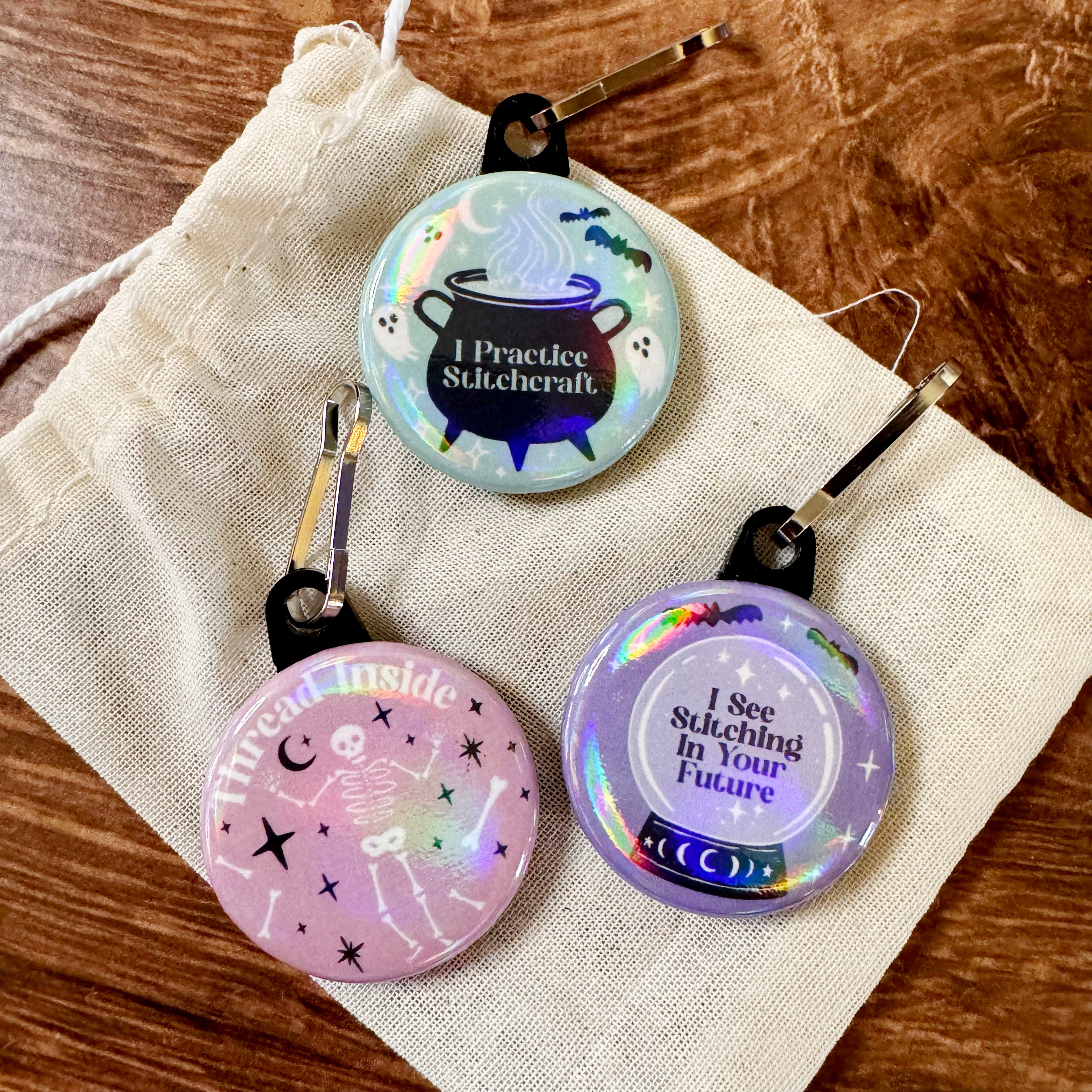Is there anything more terrifying than a broken zipper pull on your project bag? These snarky and stitchy themed zipper pulls are perfect to add to your Halloween project bags. The clips are also large enough that they could be attached to scissors if you prefer to use them as a fob.